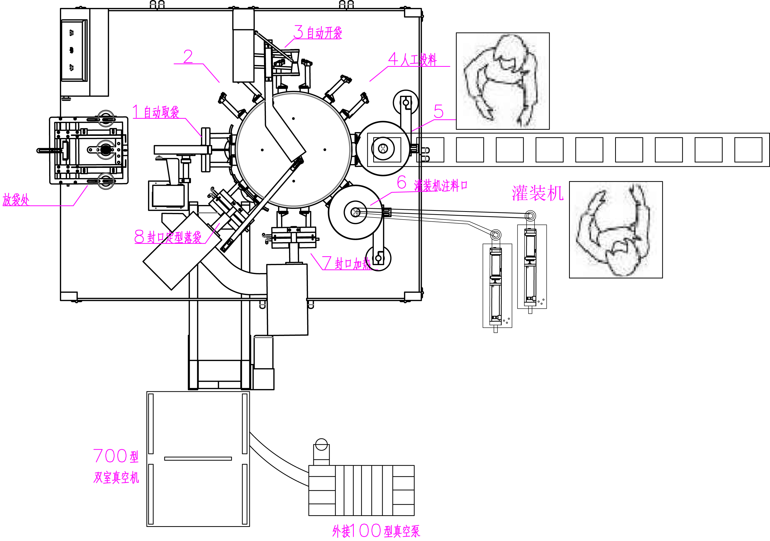 此設(shè)備有給袋式包裝機(jī)、醬料灌裝機(jī)、真空包裝機(jī)三部分組成。